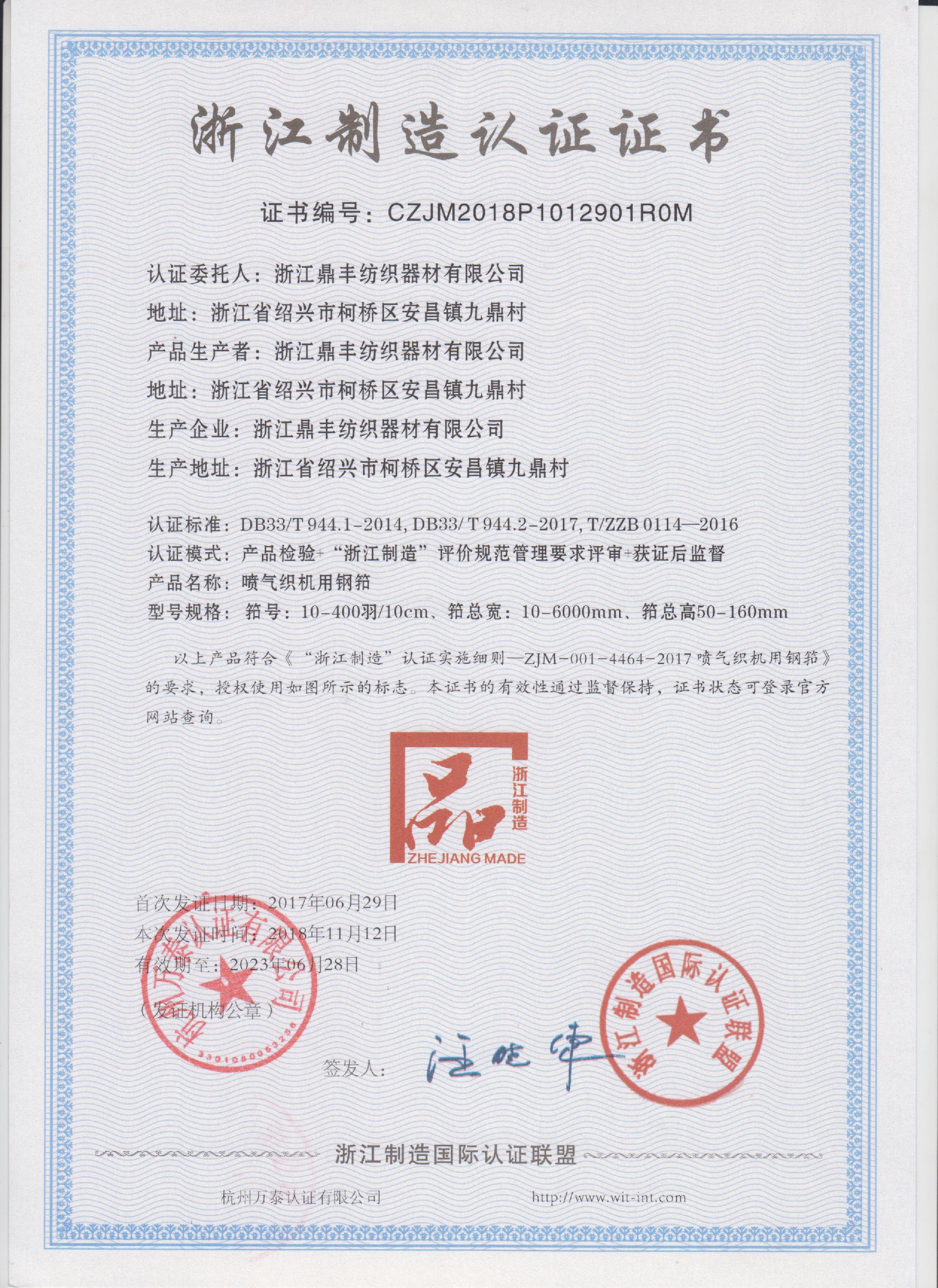 浙江鼎豐紡織器材有限公司始建于1986年,是一家專業(yè)生產(chǎn)各類無梭織機用鋼筘:噴氣筘、噴水筘、劍桿筘、其他類型鋼筘;鋁合金綜框、鋼片綜、停經(jīng)片、經(jīng)軸、織軸、卷布輥等產(chǎn)品及配件的民營企業(yè)。